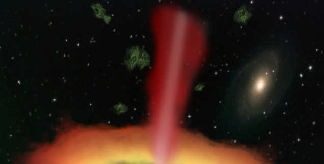 - Rectangle with color band that is a gradient from light to dark red: Relativistic Radio Jets – the relativistic radio jets shoot particles away from the black hole at nearly the speed of light.