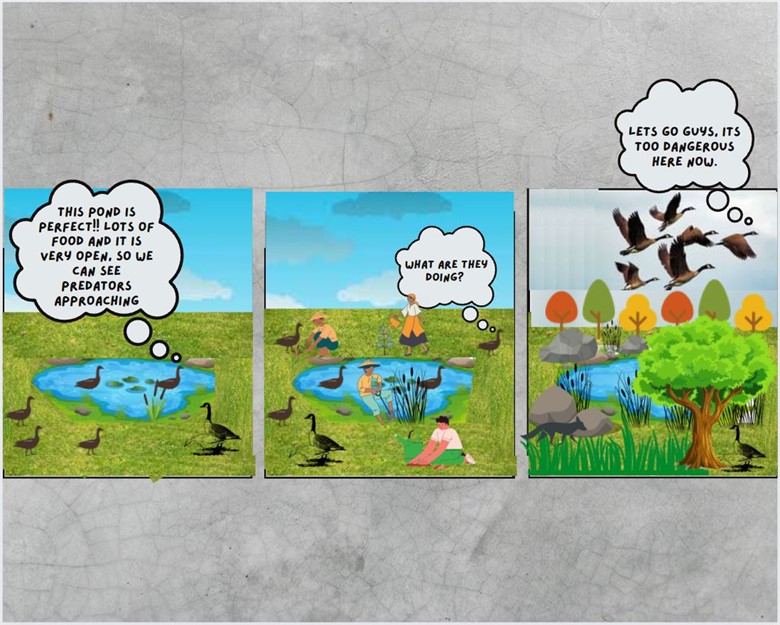 This comic represents an effective way to show a stakeholder group how new ideas can help solve an issue that current strategies are struggling to resolve. Specifically, this comic shows that by utilising different vegetation you can prevent geese from colonizing an area due to a lack of resources and an increase in predation potential.