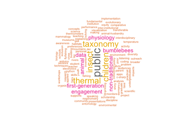 After reading this paper I understood the importance of developing an impact identity and how it could be used to inform how my science may impact society, but even though they explained each dimension of this intersecting impact identity, I was still unsure about how to practically implement the information for myself. Then I had it, as someone who often spends time converting research findings into visual, graphical representations I realized that I could create a Venn diagram analog to help me understand what my impact identity would look like—a word cloud. It was a practical way to incorporate the theory of an impact identity, with a bit of math, to visualize what the center of figure 1 would mean for me. Here’s what I got…