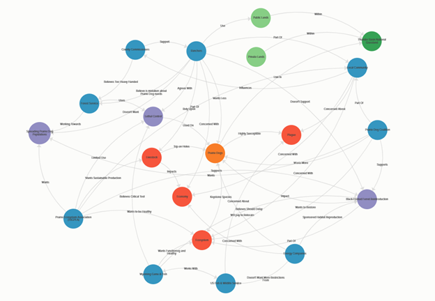 This systems map, and the analytical breakdown of the different connections and relationships, was created with the intention of helping the project’s working group, comprised of members of each of the stakeholders and convened by the Forest Service, to provide better advice on how prairie dog populations should be managed in the Thunder Basin National Grassland in Wyoming. Because the working group is made up of members from each of the described stakeholders it is intended to help them to better visualize and understand the different connections that they all have with each other that they may not have known about before. It is also intended to help them to understand how some of the previously proposed management actions and alternatives would affect those other groups, and why, through those newly visualized connections. This systems map can also be used by the public, or other involved parties who are not part of the working group, who want to better understand the connections and relationships of this management project. Especially for those in the Thunder Basin Grassland area or those who also have a prairie dog population to manage work with.